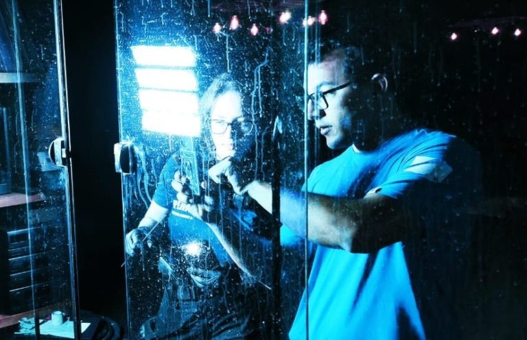 Peritos papiloscopistas durante exame pericial em local de crime.